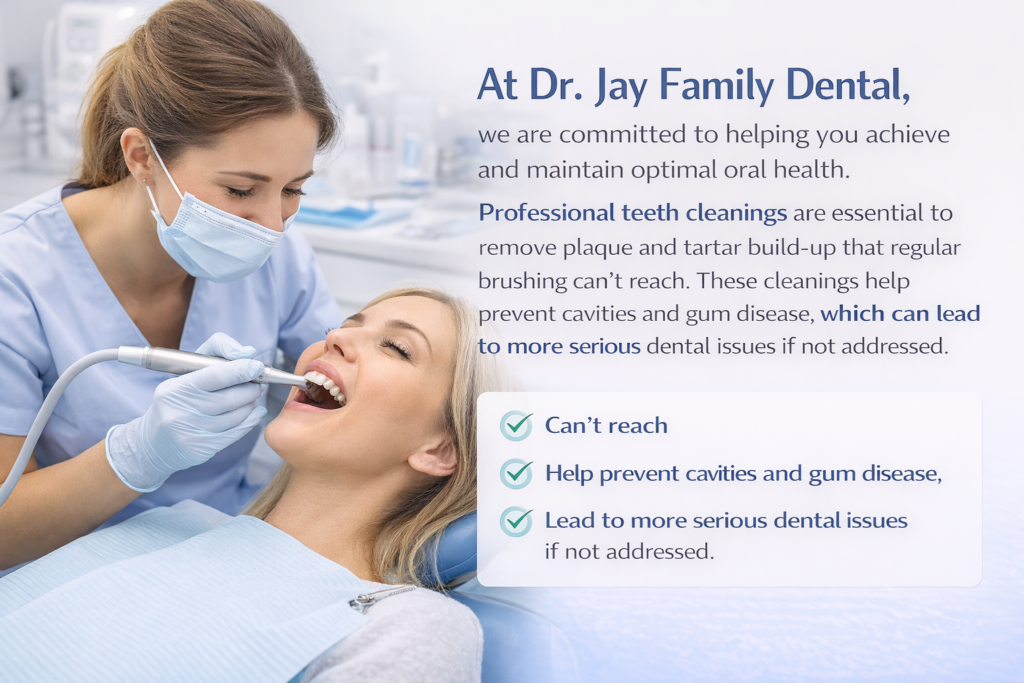 At Dr. Jay Family Dental, we are committed to helping you achieve and maintain optimal oral health. Professional teeth cleanings are essential to remove plaque and tartar build-up that regular brushing can’t reach. These cleanings help prevent cavities and gum disease, which can lead to more serious dental issues if not addressed.
